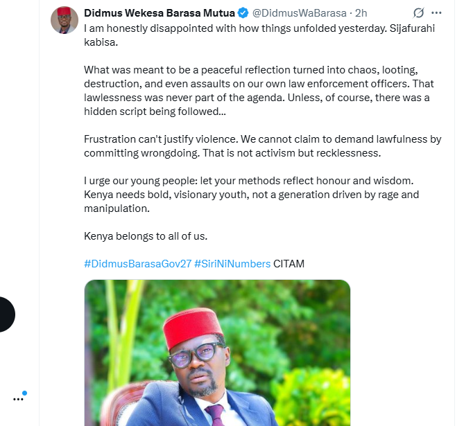 “Frustration cannot justify violence. We cannot claim to demand lawfulness by committing wrongdoing. That is not activism but recklessness,” Barasa wrote.