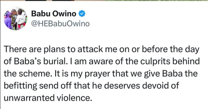 “I have received credible intelligence that there are plans to eliminate me before or during Baba’s burial,” Babu wrote. “It is my prayer that Baba receives the befitting send-off he deserves, devoid of unwarranted violence.”