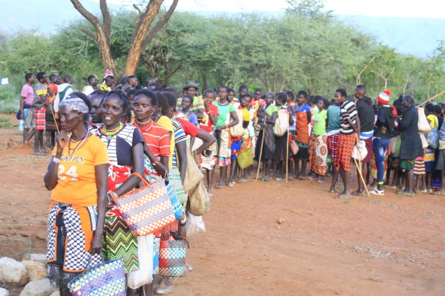 Hundreds of bandit attack returnees of Mukutani, Baringo lineup to receive food and non-food donations from state and well-wishers.