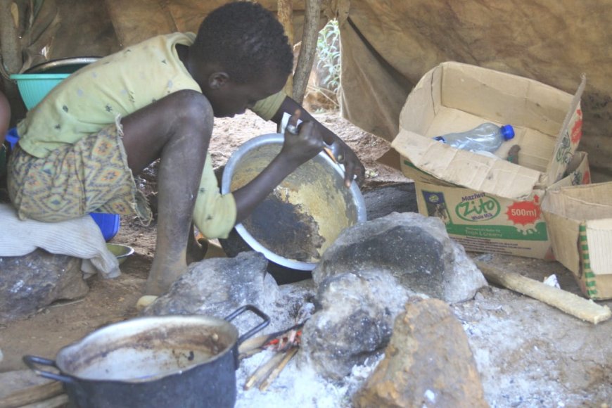 A girl preparing an evening meal inside a makeshift tent at Mukutani returnees camp in Baringo South.