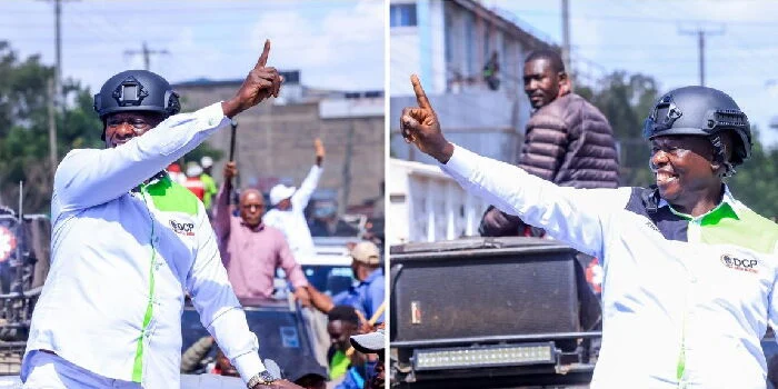 A collage of DCP Part leader Rigathi Gachagua during a campaign rally in Kariobangi North wearing a helmet on November 26, 2025